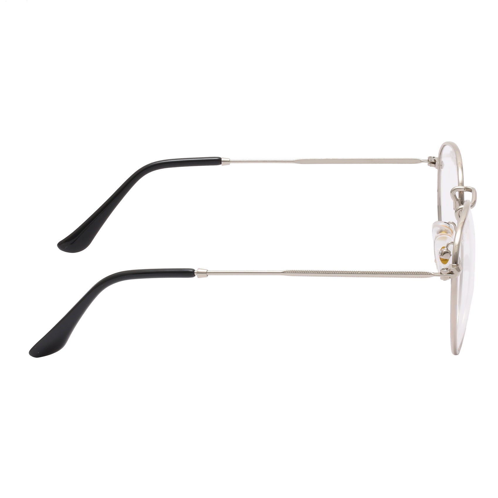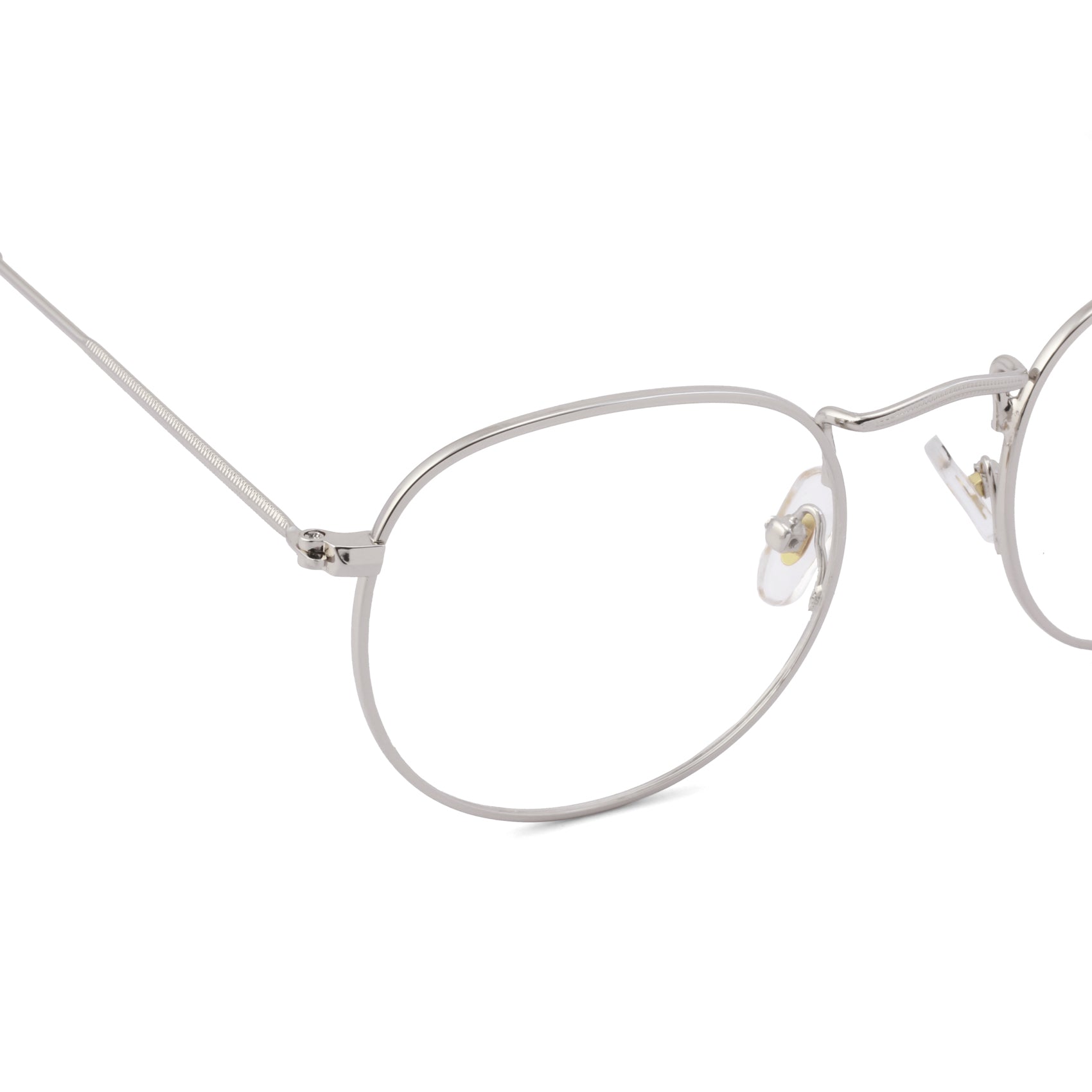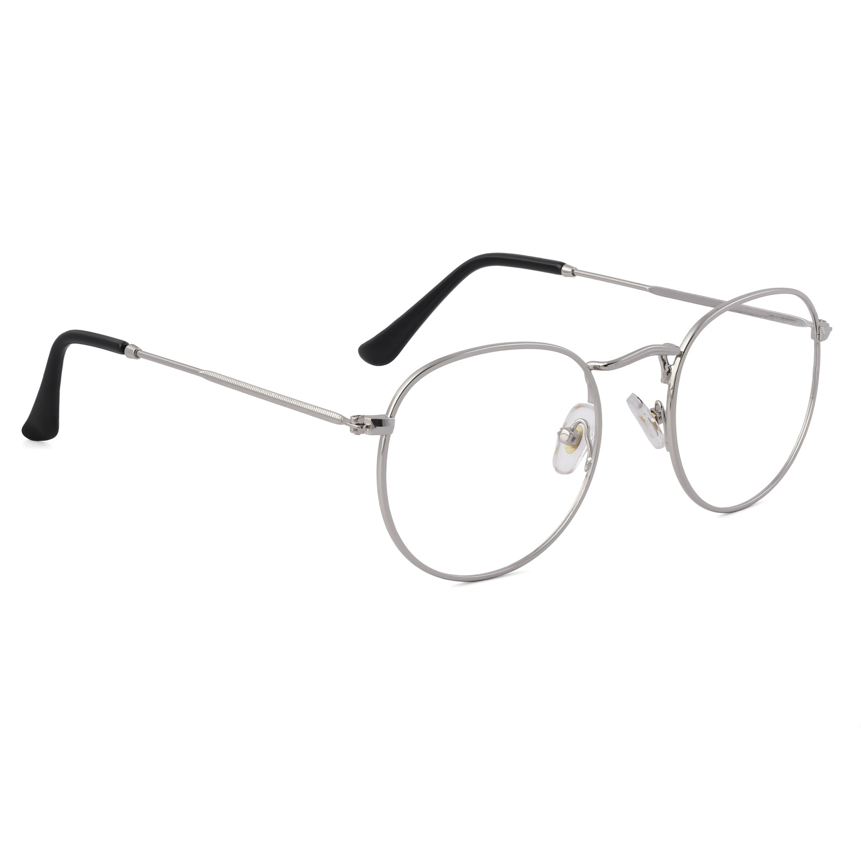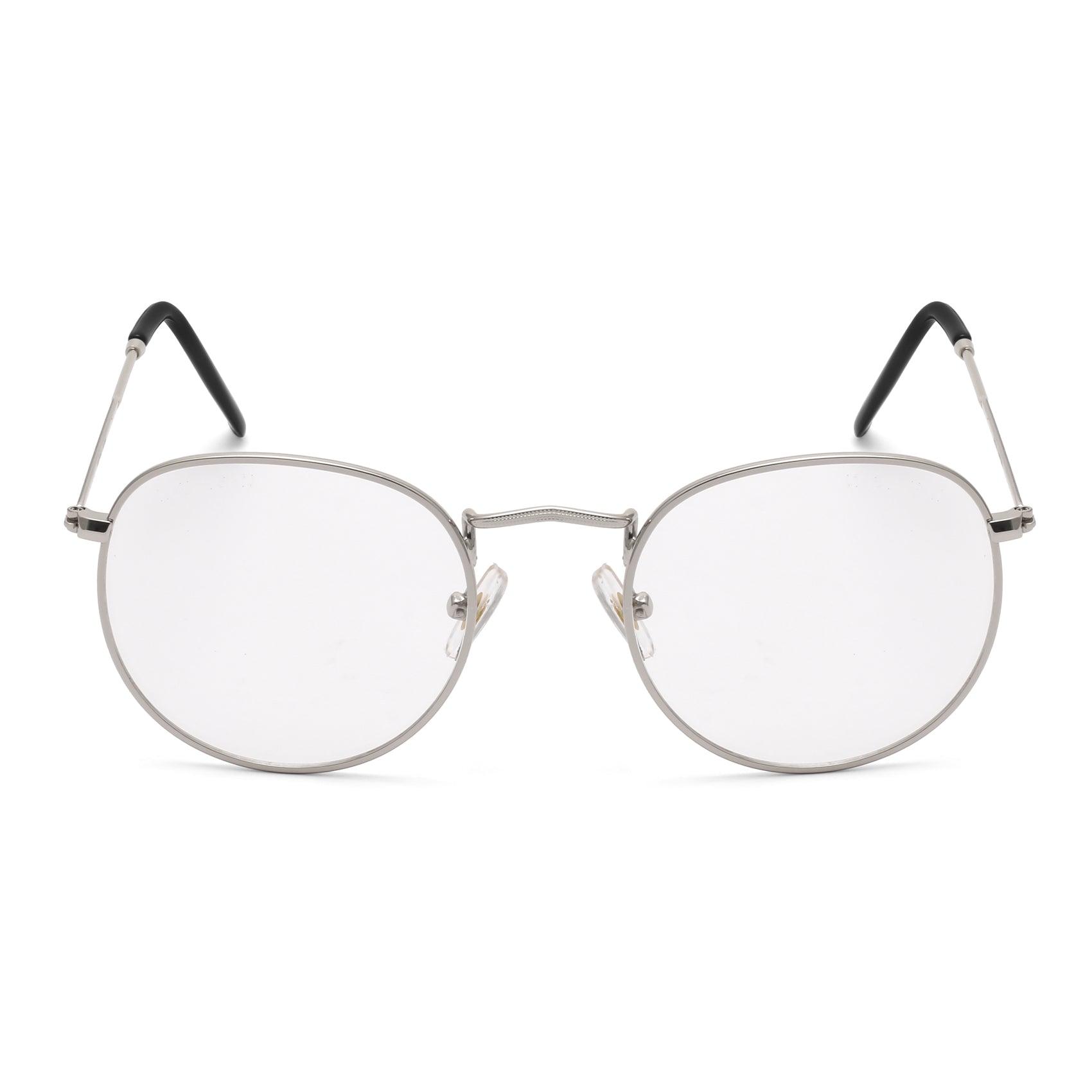 【About Frame and Temple】:- Material: Metal | Type: Round | Color: Silver | Nose Pads: Soft | Temple Spring : No. This full-rim Chasma frame is made with Metal. The frame is lightweight. It looks Classic for both men & women.